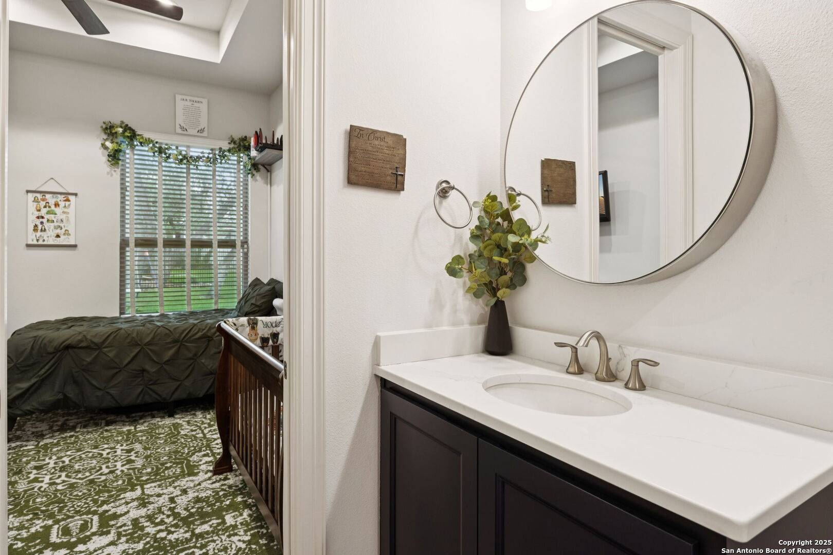 Within The Dominion's gates, this single-story residence offers a layout that feels open and grounded. Interiors are defined by tall ceilings, plank-style tile floors, and a sense of openness that carries through the main living spaces. A stone fireplace anchors the living room, while windows and French doors frame views to the backyard. The kitchen centers on a broad granite island with seating, complemented by shaker cabinetry, stainless appliances, and double ovens. Just beyond, the dining room is finished with a built-in bar that makes the space feel designed for gatherings. The primary bath features a freestanding tub set before a charcoal-tiled partition wall with a walk-through shower behind, paired with wide vanities and soft lighting. Outdoors, a covered patio with a built-in grill and ceiling fan overlooks a deep, fenced yard shaded by mature oaks and offering more space than typically found in The Dominion. 4 Bed 4 Full Bath 2,828 Sq.Ft. 0.25 Acre Formal Dining 2-Car garage Listed at $979,900