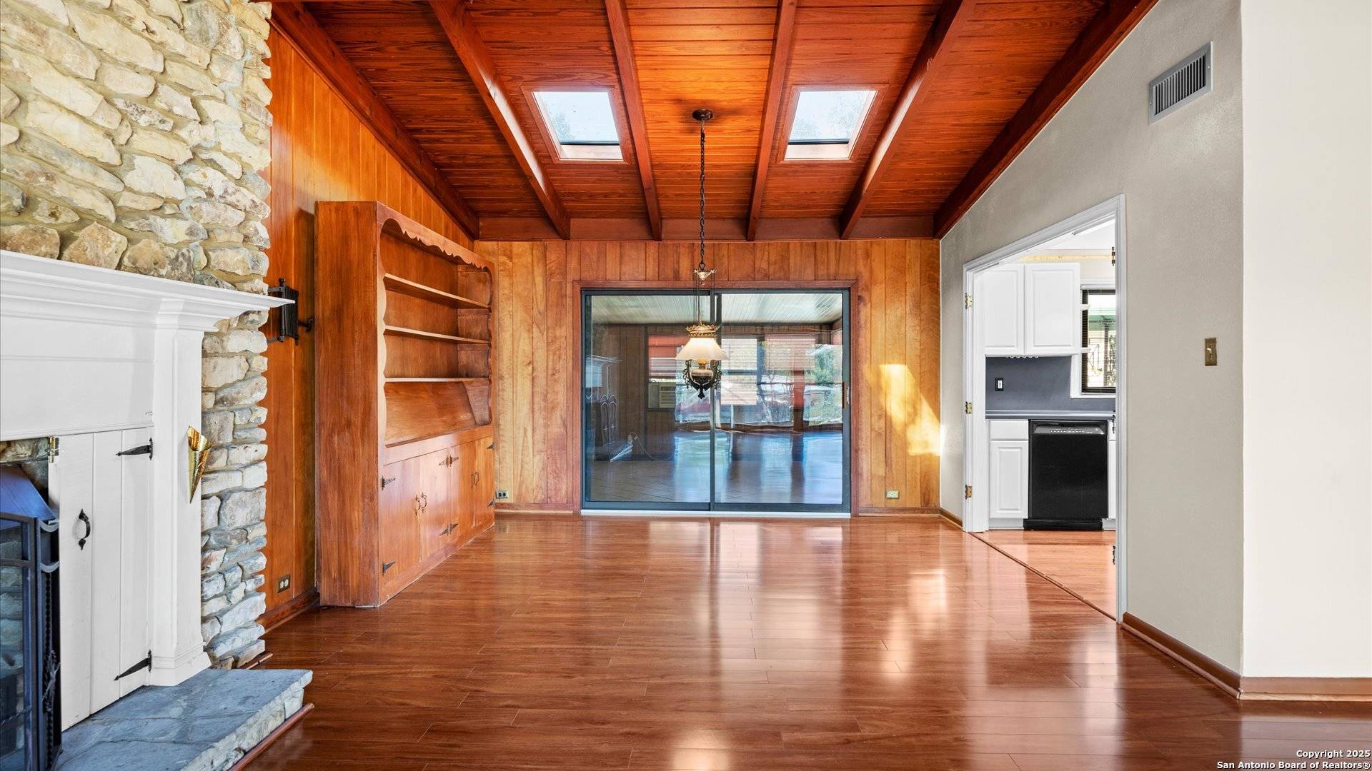 Vintage charm meets modern comfort in this beautiful one-story ranch-style home located in the highly desirable Terrell Hills area. Resting on a picturesque park-like corner lot of over one-third acre, this property is surrounded by mature trees, lush landscaping, and multiple outdoor spaces perfect for entertaining or relaxing by the custom-designed pool. Step inside to discover an inviting open-concept living, dining, and kitchen area that feels both spacious and warm. The main living room features a striking floor-to-ceiling stone gas fireplace, a vaulted wood-lined ceiling with exposed beams, and three large picture windows that fill the space with natural light. Skylights in the dining area enhance the bright and airy atmosphere, while a side nook offers a convenient spot for a home office. A bonus room off the dining area adds flexibility. Ideal for use as a sunroom, game room, craft space, or cozy second living area. Throughout the home, wood, laminate and tile flooring and vaulted ceilings with exposed beams blend timeless style with practical comfort - and there's no carpet in the house. The primary suite includes private backyard access, a spacious ensuite bath with both a tub and separate shower, and generous natural light. The secondary bedrooms are equally inviting, featuring vaulted ceilings and multiple windows. Both bathrooms retain their original vintage character, maintaining the home's nostalgic appeal. Outdoors, you'll find several seating areas to enjoy the shade and scenery, along with a detached two-car garage and a charming casita complete with kitchenette, full bath, and its own private outdoor area, perfect for guests or a studio space. Additional highlights include a metal roof, newer HVAC system (10-year warranty, which includes twice a year service Maintenance, 10 years parts & labor), gutter system, cedar closet with double doors, separate storage area and a utility area with sink behind the garage that can easily be relocated to the main home if desired. Located in the coveted Terrell Hills community, this home enjoys access to its own dedicated police department, located less than two miles away, and a shared fire department with Alamo Heights. You'll love the convenient location, just one mile to several shopping centers including H-E-B, Walmart, Lowe's, and Target, and only a quarter-mile to numerous restaurants. It's also minutes from major freeways, close to Ft. Sam Houston, and just a few blocks from Terrell Hills Kiddie Park. Nearby, enjoy bike and walking trails along the San Antonio Riverwalk, lined with cafes and entertainment, and the DoSeum (Children's Museum) across from Brackenridge Park, all just a short drive away. This home perfectly combines vintage charm, modern conveniences, and an unbeatable location, making it a rare find in one of San Antonio's sought-after neighborhoods.