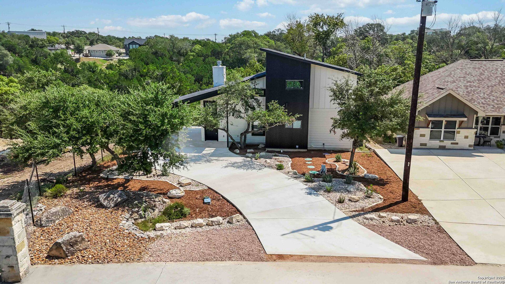 Back on the market due to buyer's financing. Priced to sell, under $16,000 below county appraisal value - Motivated sellers. Modern Hill Country retreat with stunning views! This brand-new custom home blends sleek modern design with everyday comfort. Inside, soaring ceilings, an open-concept layout, and a striking black-accented wood-burning fireplace create a stunning centerpiece for the living room. The chef's kitchen boasts stainless steel appliances, quartz countertops, an oversized island, and designer pendant lighting. Large windows and double French doors fill the home with natural light and open to the expansive deck-ideal for entertaining or taking in serene Hill Country sunrises. The main-level primary suite offers a private retreat with contemporary finishes, a walk-in shower, and a double vanity. Upstairs, a secondary bedroom with its own full bath also opens to the upper-level deck, providing comfort and convenience for guests. The loft offers flexible space for a second living area, office, or creative studio-with clerestory windows for beautiful natural northern light and direct deck access to enjoy treetop views. Additional highlights include modern stair railings, a covered carport, and low-maintenance xeriscaping featuring deer-resistant plants such as oleander, cacti, and Texas sage, set among river rock, decomposed granite, and limestone planters. Nestled on a private lot with tree-top views, where you can often spot grazing bucks in the area. This property offers both style and tranquility. Ideal as a full-time residence, weekend retreat, or short-term rental investment.