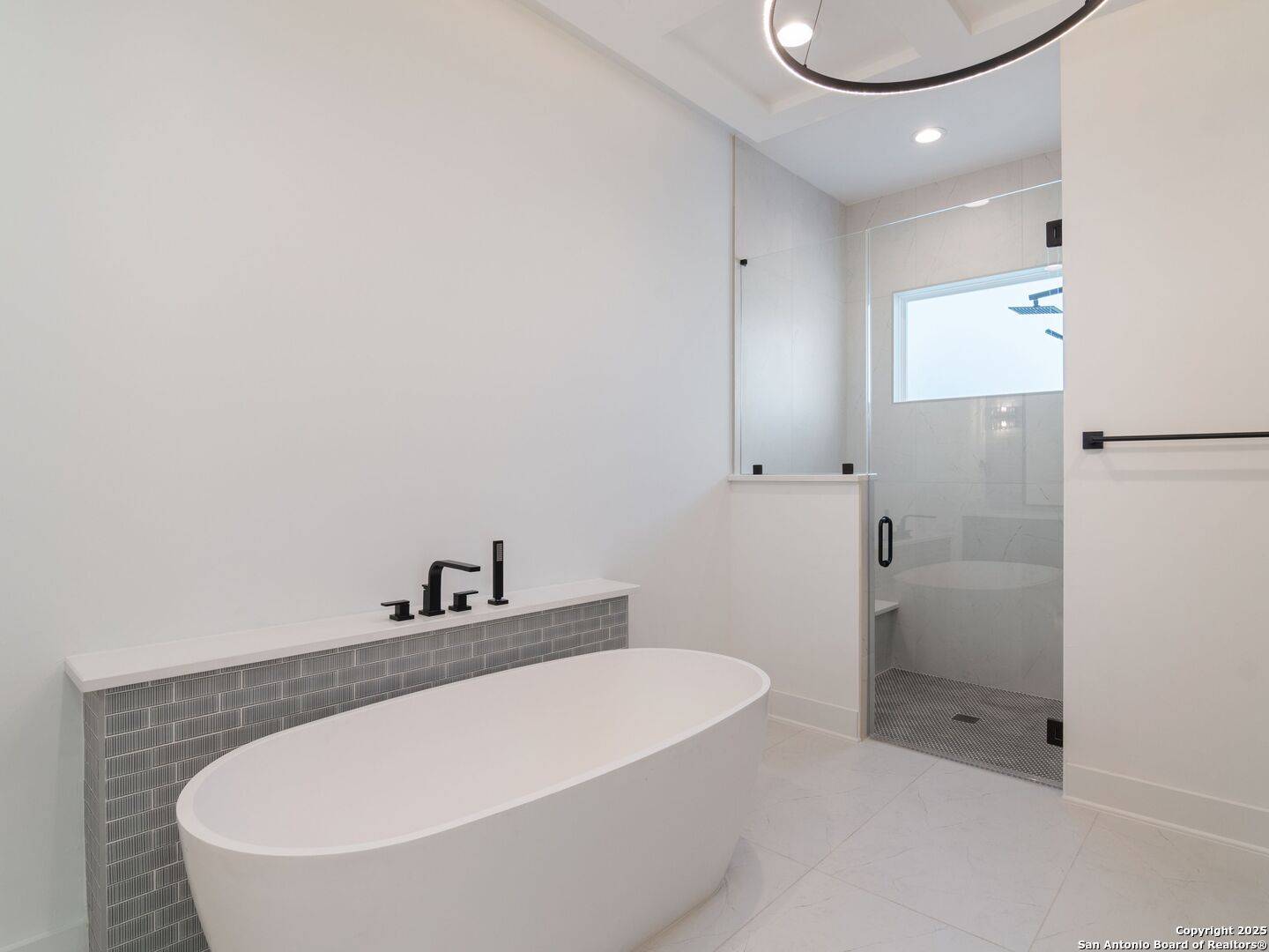 Discover elevated living in Dominion Heights, the newest enclave within The Dominion. This residence blends architectural intention with modern comfort, designed by Gustavo Arredondo and crafted by Dwell Dominion Group with refined materials, natural light, long sightlines, and seamless indoor-outdoor connection. A five-foot by ten-foot steel pivot door opens to a voluminous entry framed by floating wood stairs and curated ceiling treatments with cove lighting. The main level lives as a true single-story experience with soaring ceilings across the great room, dining area, and chef's kitchen. Walls of windows capture uninterrupted views of the private courtyard, creating a calm center point visible from the main living spaces and the primary suite. The kitchen pairs clean lines with performance: double-stack maple cabinetry, quartz surfaces, a pot-filler, and a full Cafe Series appliance suite including a 48" built-in refrigerator, 36" commercial-style gas cooktop, double ovens, and wine cooler. The primary suite is refined and serene, offering a floating double vanity with toe-kick lighting, a mosaic-tiled feature wall, a free-standing soaking tub with quartz ledge, and an oversized frameless-glass shower. A secondary bedroom on the main level offers flexibility for guest accommodations or a dedicated office. Upstairs, a private third bedroom with en-suite bath accompanies a loft-style living space ideal for lounge or media use. Exterior architecture features stucco masonry with stone and Ipe accents, a metal roof, stained concrete porches, full irrigation, and a landscaped courtyard framed by a sculptural metal trellis and water feature. The oversized two-car garage includes epoxy flooring and additional room for a golf cart. Quality features include open-cell foam insulation, two Lennox 16-SEER heat pump systems, a Rinnai tankless water heater with recirculation loop, Low-E windows, LED lighting, and engineered structural framing. The social membership initiation fee to The Dominion Country Club is included with the home purchase.