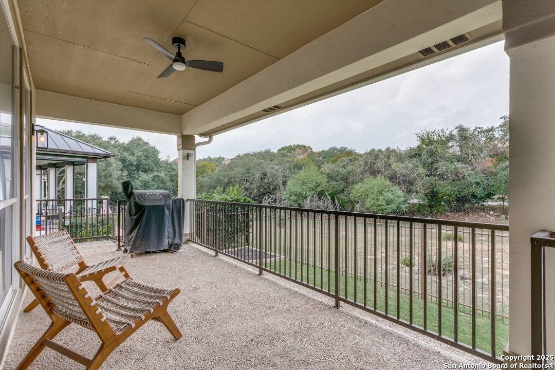 Discover a meticulously updated single story home nestled on a picturesque greenbelt lot in the prestigious Dominion. This exquisite residence welcomes you with a stunning two story entryway, leading into an open floor plan accented by soaring ceilings and abundant natural light. The main living areas poised for transformation with new wood flooring, seamlessly connect to the formal dining room and spacious family room, complete with a newly installed decorative electric fireplace. The recently updated chef's kitchen is complemented by stainless steel appliances, custom cabinetry, and stylish backsplash. Gather around the oversized quartz island, which serves as the perfect centerpiece for entertaining, or enjoy a family meal in the eat-in area overlooking the back yard. Retreat to the primary suite, a serene haven featuring a generous layout. Indulge in the spa like ambiance of the impeccable bath, equipped with a soaking tub and an oversized walk in shower. The sophisticated closet is designed with custom drawers and is illuminated by designer lighting. This home also features a beautifully appointed secondary bath with upscale decor, perfectly matching the two additional bedrooms thoughtfully located in their own private wing. The utility room has been tastefully updated with chic tile flooring, a stylish backsplash, and convenient shelving. Step outside onto the covered patio, ideal for outdoor cooking. On cooler evenings, gather around the inviting fire pit and enjoy the freshly landscaped yard, to be completed in early December 2025. This home is a true sanctuary, perfect for those who appreciate luxury living in an idyllic setting!